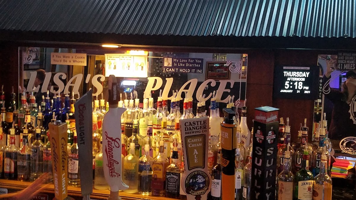 Stepping into Lisa's Place in downtown Carver is like finding a well-worn local gem where time moves at its own easy rhythm. The walls carry stories in the form of classic bar memorabilia and dollar bills pinned above, creating a space that feels lived-in and welcoming. It’s the kind of spot where familiar faces greet you with a nod, and the hum of relaxed conversation blends effortlessly with the clink of glasses.